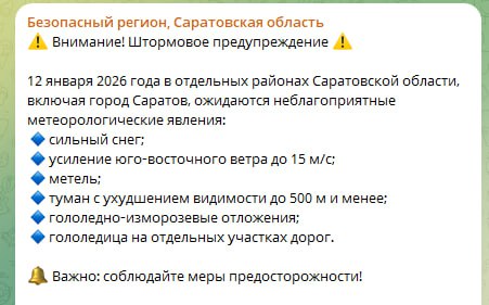 Завтра, 12 января 2026 года, в Саратове и отдельных районах области ожидаются сильный снег; усиление юго‑восточного ветра до 15 м/с; метель; туман с ухудшением видимости до 500 м и менее.