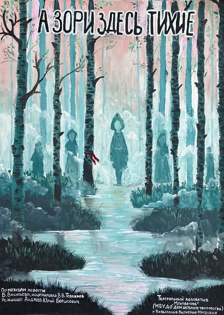 Ермакова Виктория – 13 лет – Краснокутская ДШИ - афиша к спектаклю театрального коллектива «Мгновение» г. Ковылкино Республика Мордовия «А зори здесь тихие» по мотивам повести Б. Васильева;