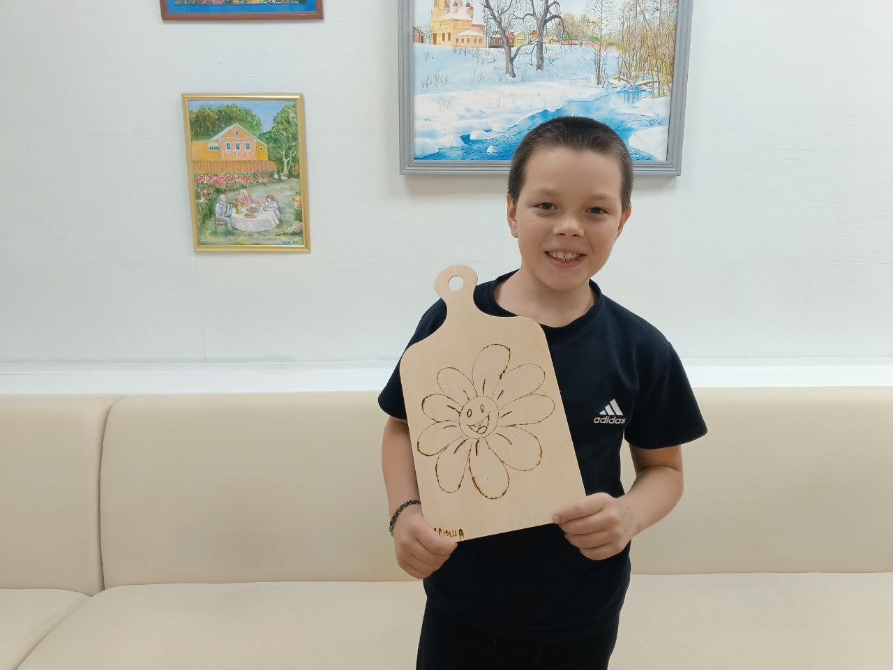 Во время совместной работы, каждый ребенок старался аккуратно и точно выжечь рисунок по заготовленному эскизу. Приложенные усилия не прошли даром. В итоге каждый воспитанник справился с поставленной задачей.