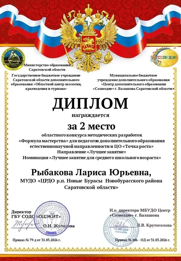 Методическая разработка педагога Экостанции Новобурасского Центра развития дополнительного образования Рыбаковой Ларисы Юрьевны, посвященная использованию растительных индикаторов — антоцианов, была оценена жюри конкурса. Педагог награждена Дипломом II степени.