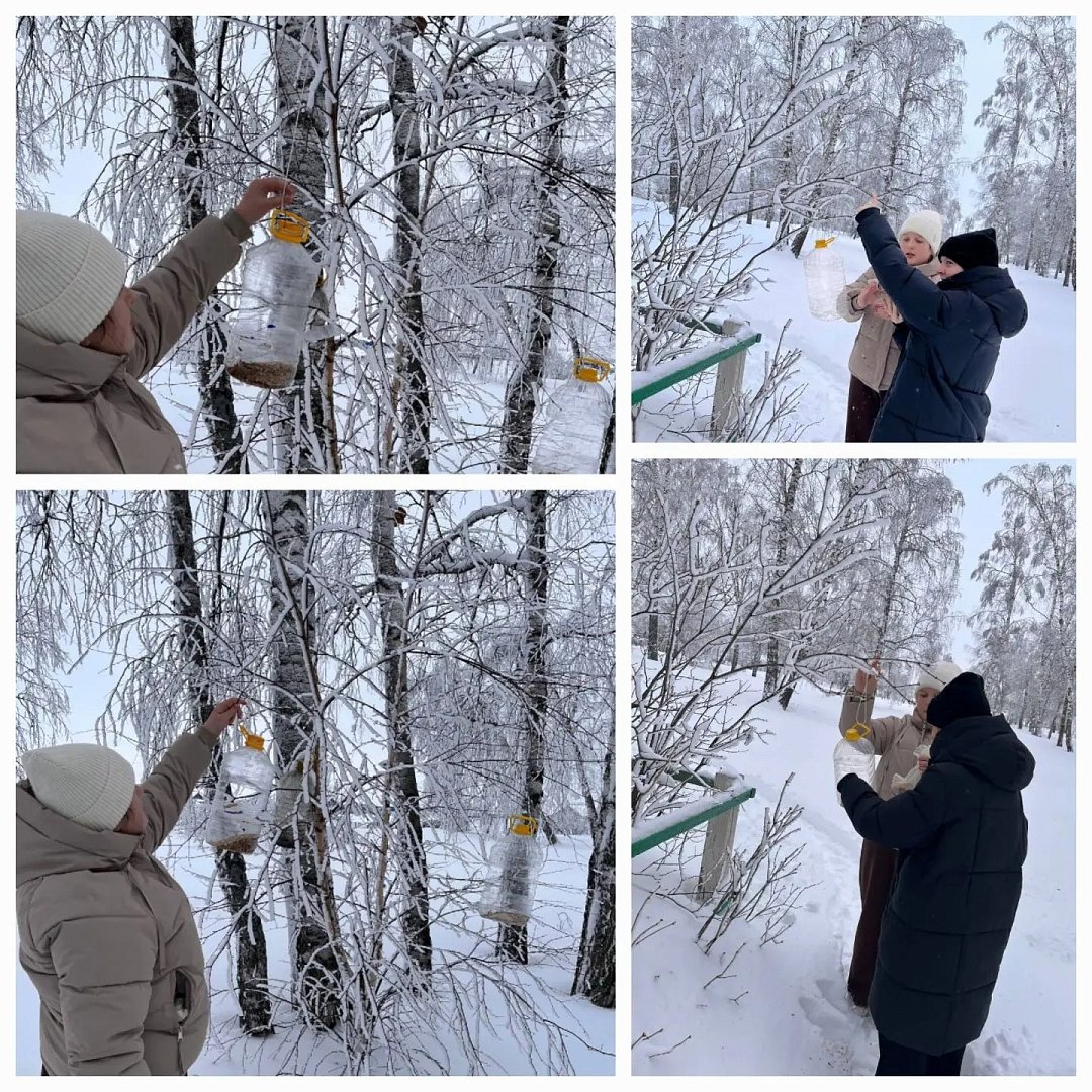 Затем воспитанники развесили кормушки на кустарники и деревья, насыпав в них зерносмесь.