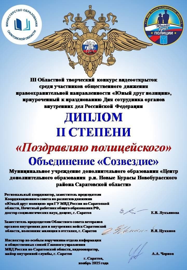 Обучающиеся объединения "Созвездие" Центра развития дополнительного образования рабочего посёлка Новые Бурасы, приняли участие в III Областном творческом онлайн конкурсе видеооткрыток «Поздравляю полицейского», приуроченном к празднованию Дня сотрудника органов внутренних дел Российской Федерации.