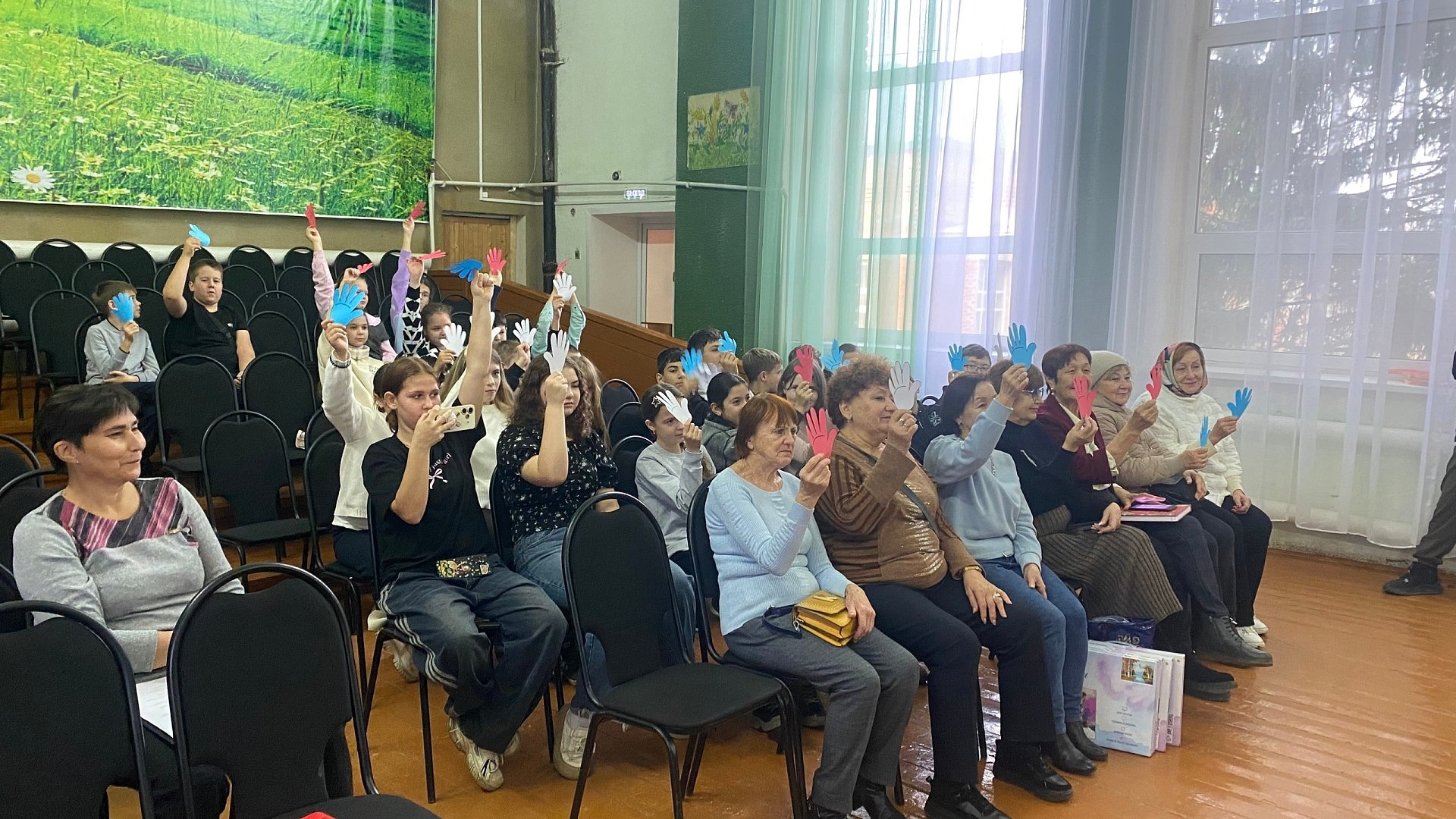 Советник директора Крюкова В. В. провела интерактивное задание с ладошками. Каждая ладошка — это частичка большого сердца, символ единства и любви к Родине. Вместе создали не просто картину, а настоящий символ, в который вложена душа каждого из присутствующих.