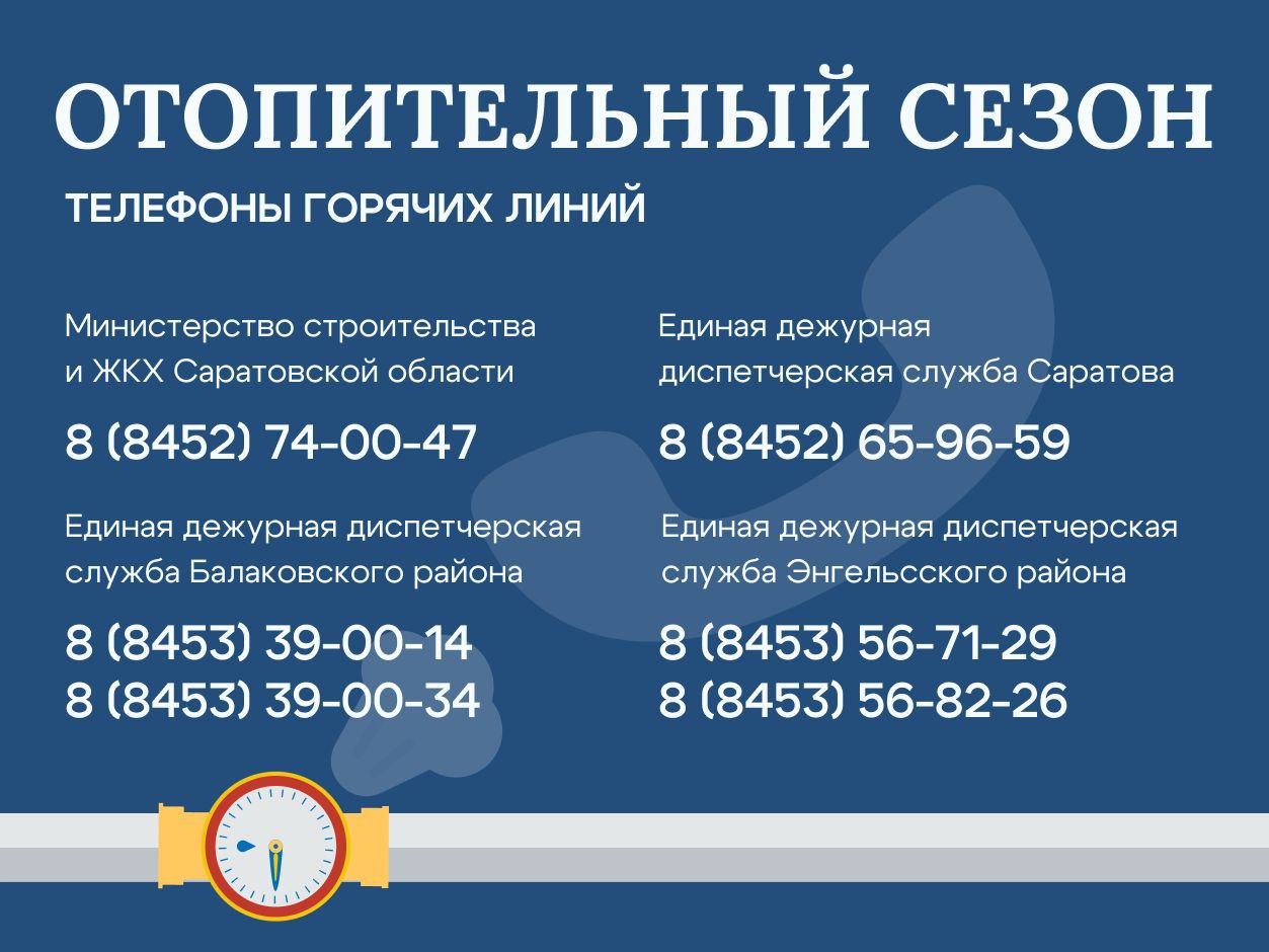 Телефон горячей линии в (название) районе - (можно узнать по ссылке: https://www.minstroy.saratov.gov.ru/utilities/telefony-goryachikh-liniy-/index.php/)