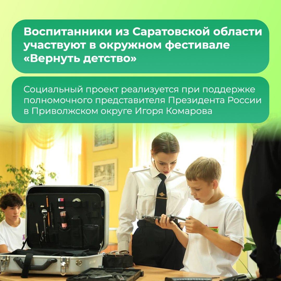 Фестиваль «Вернуть детство» проходит в Уфе. Его организуют для поддержки и социальной адаптации детей-сирот и ребят, оставшихся без попечения родителей. В мероприятии участвуют 370 детей и подростков Приволжского округа, в том числе 34 воспитанника из 5 учреждений Саратовской области.
