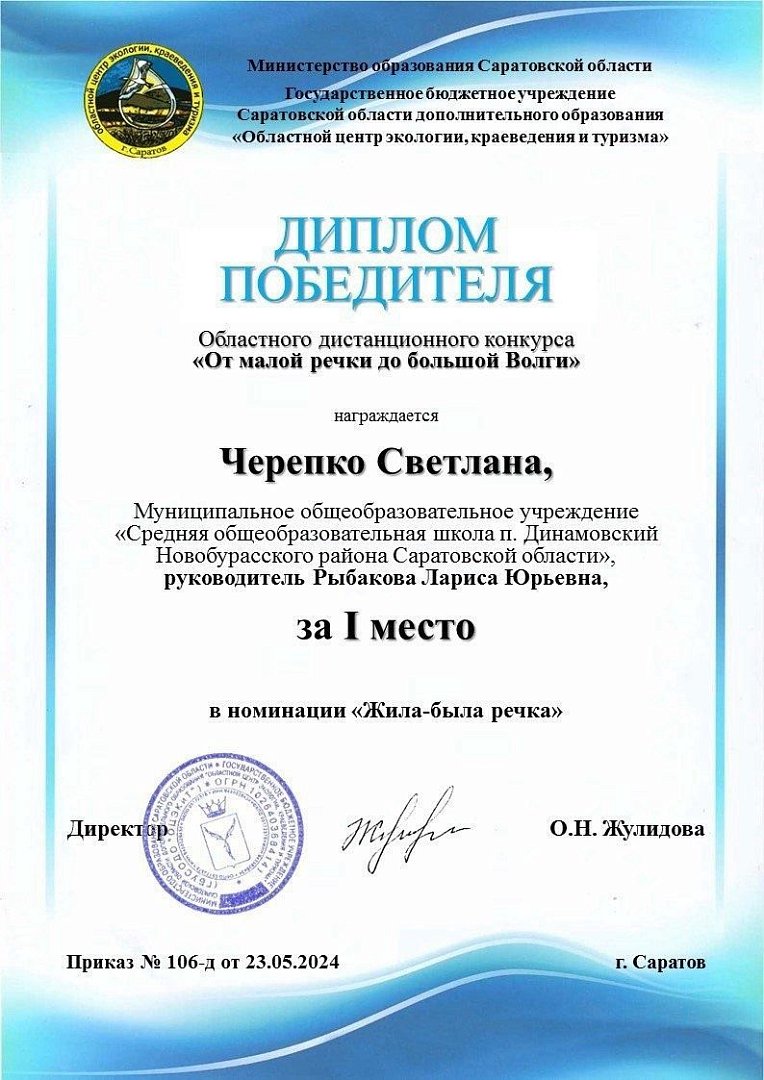 Обучающаяся Экостанции МУ ДО "ЦРДО" Черепко Светлана стала победителем регионального конкурса «От малой речки до большой Волги» (номинация «Жила - была речка») с работой о Соколке.
