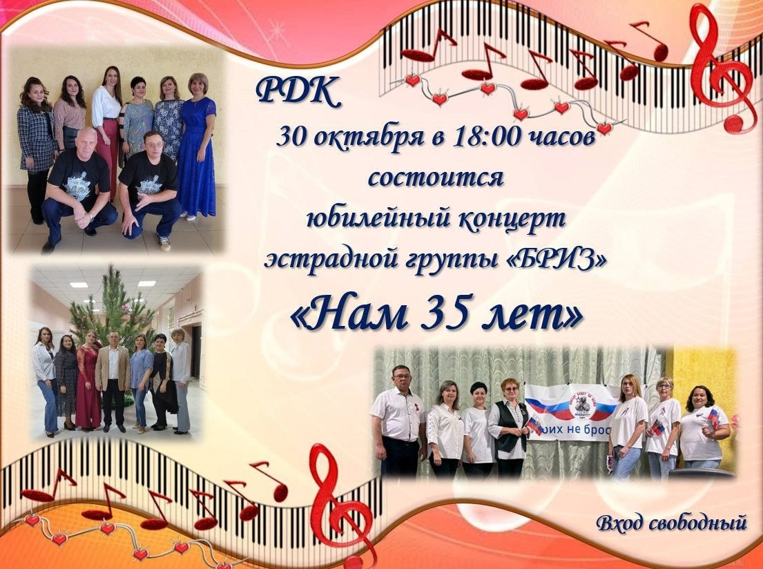 Приглашаем вас на юбилейный концерт – 35-летие эстрадной группы "Бриз"! Этот вечер станет ярким калейдоскопом музыкальных воспоминаний, посвященных творческому пути коллектива, который на протяжении многих лет радует своим искусством.