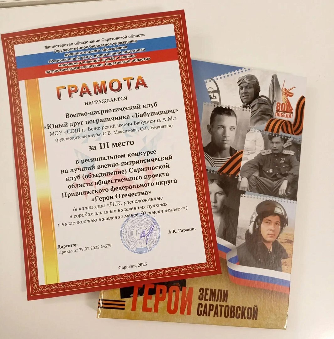 Военно-патриотический отряд "Юный друг пограничника "Бабушкинец" МОУ "СОШ п. Белоярский имени Бабушкина А. М." (рук.: Максимова С. В., Николаев О. Г.) принял активное участие в Региональном смотре-конкурсе на лучший военно-патриотический клуб Саратовской области и занял 3 место.